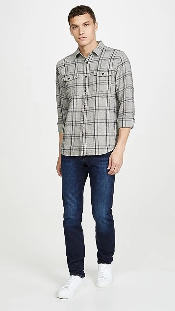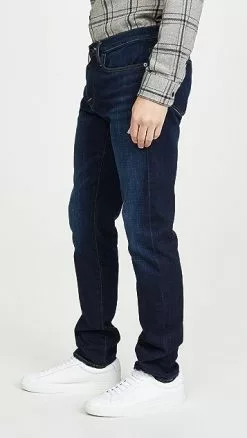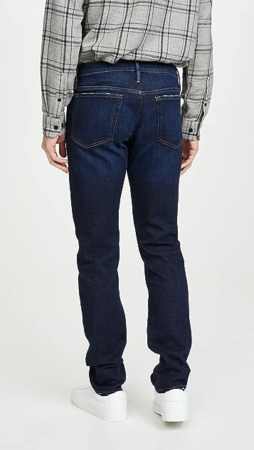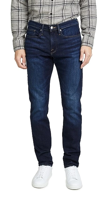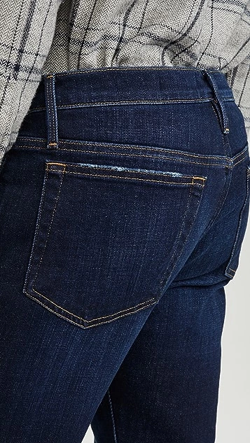 A pair of FRAME skinny jeans with ample stretch, presented in a dark blue, heavily faded wash.